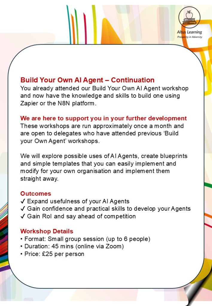 AI Practical Workshops - Discover how AI can benefit you through three interactive online workshops. Workshops, dates and times: AI Agents – Threat or Opportunity? | 14th November | 1 pm to 2 pm| Free How to Introduce AI into Your Workfloe – Step by Step | Enquire for dates and times | £65 per delegate Build your own AI Agents – Hands-on workshop | 21st November (Friday) | 11 am to 12.30 pm | £120 per delegate Build your own AI Agents – Continuation Workshop | 28th November (Friday) | 11 am to 12.30 pm | £25 per delegate | Limited to 6 places |By invitation only – for delegates who attended previous “Build Your Agent” workshop To register interest and reserve your place, please email: info@altuslearning.co.uk Go Back info@altuslearning.co.uk