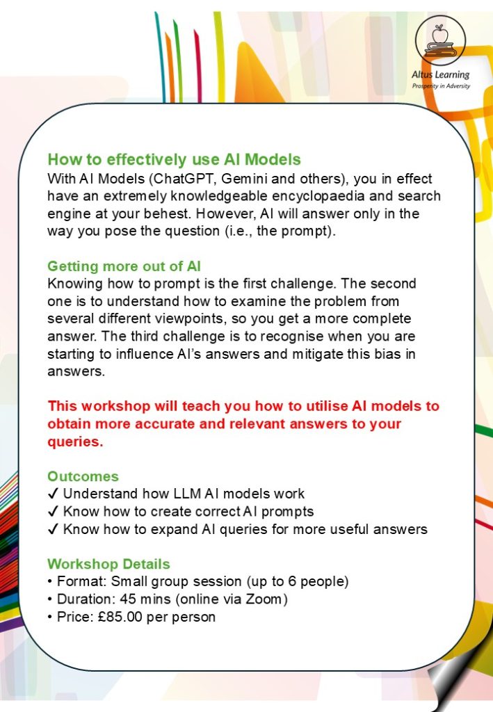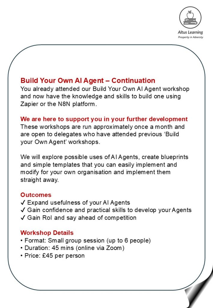 Altus Learning Off-the-Shelf Courses and Workshops Enquire for dates and times or express interest. info@altuslearning.co.uk Book Meeting | Professional Profile | LinkedIn Profile | Training Catalogue | Supporting AI Implementation | Knowledge Page | Home